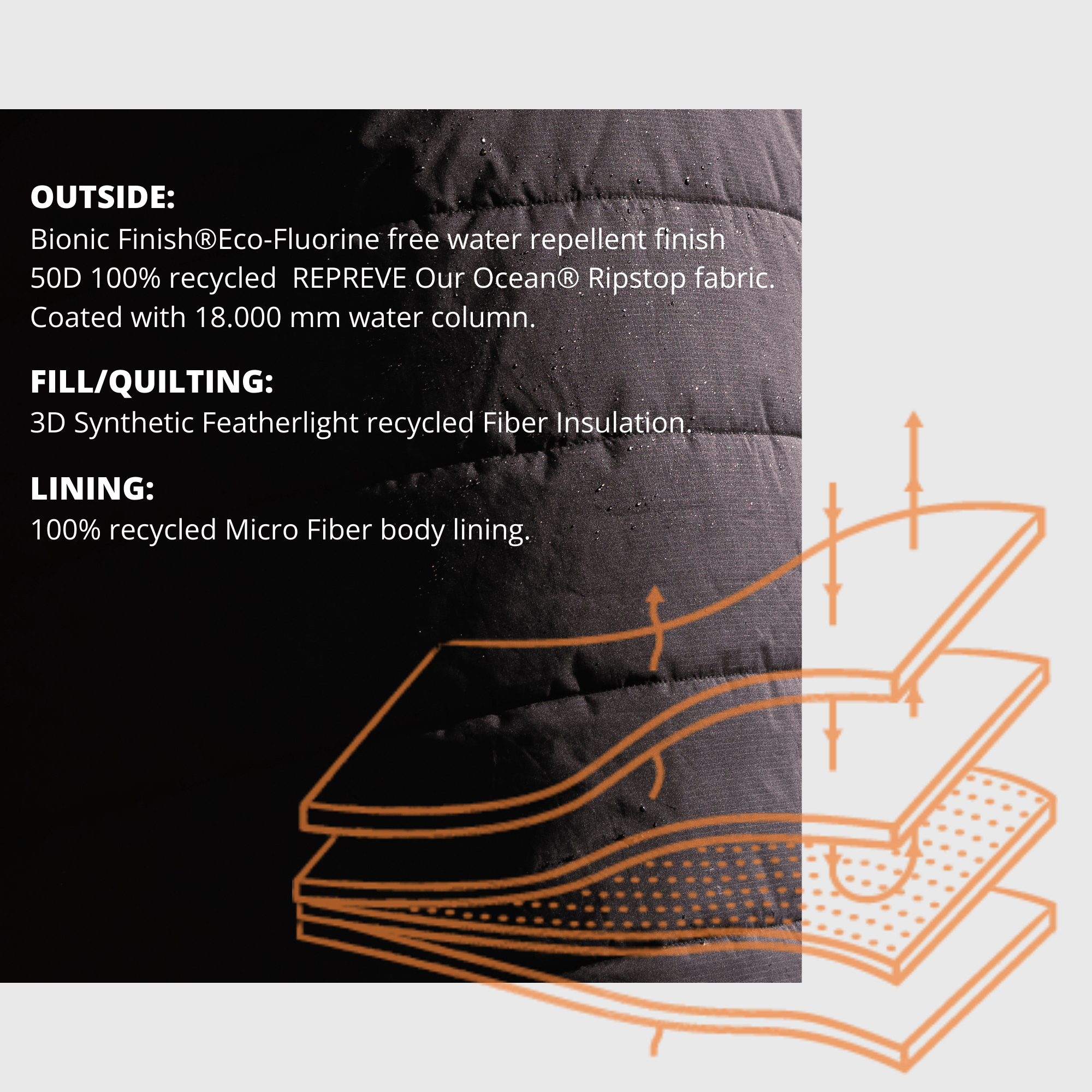 100% recyceltes 50D REPREVE Our Ocean® Gewebe ist mit einer 18.000mm wasserdichten Säule und einem Bionic Finish®Eco Fluorine Free wasserabweisendem Finish beschichtet -